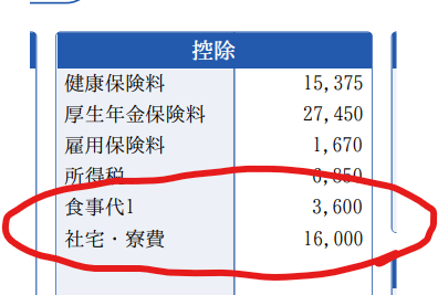 ↓加えて、私の給料明細の一部。賄い費が月3,600円